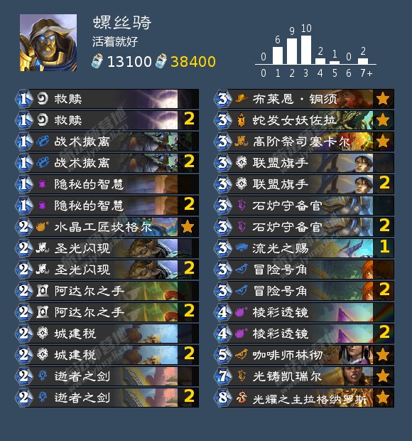 攻略就是起手找过牌和水晶工匠再加光螺丝。如果对战活人就苟到10费打出光螺丝加水晶工匠,一次性+16进度。实在顶不住就8费光螺丝+8进度吧,成就卡组就是这样缺乏战斗力。但如果打人机就舒服了,铜须蛇发女妖加咖啡师的组合,一直回手334就好了,可以无限卖血甲飞天,这样就可以光螺丝无限奶了。