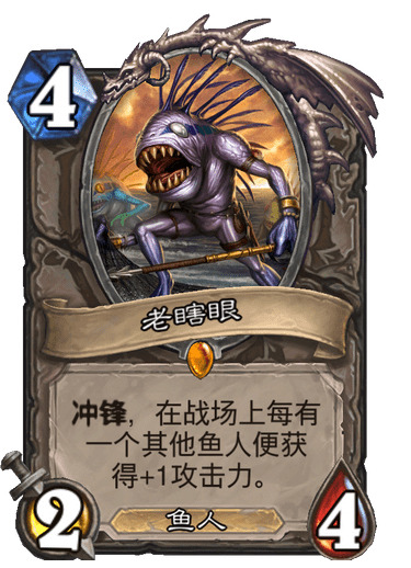 OK,很明显写这个卡组我是为蹭新版本热度新版本鱼人术回忆打法,开拓思路而来。鱼人虽身材瘦弱,但集体BUFF居多,一直受到许多快攻卡组的青睐,不得不说,以前的领军真猛,除了加攻,血也能加,老瞎眼,对面的鱼人也能提供BUFF,老瞎眼是冲锋啊!