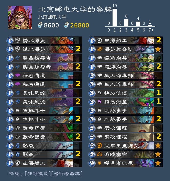 但是,有一张牌,只需要一费就可以破坏随从体系的otk,它就是美味风蛇!如果往奇数贼卡组里面塞入两张美味风蛇,就可以很好的针对两大马王,至少不会被每个天胡的马王胡死。