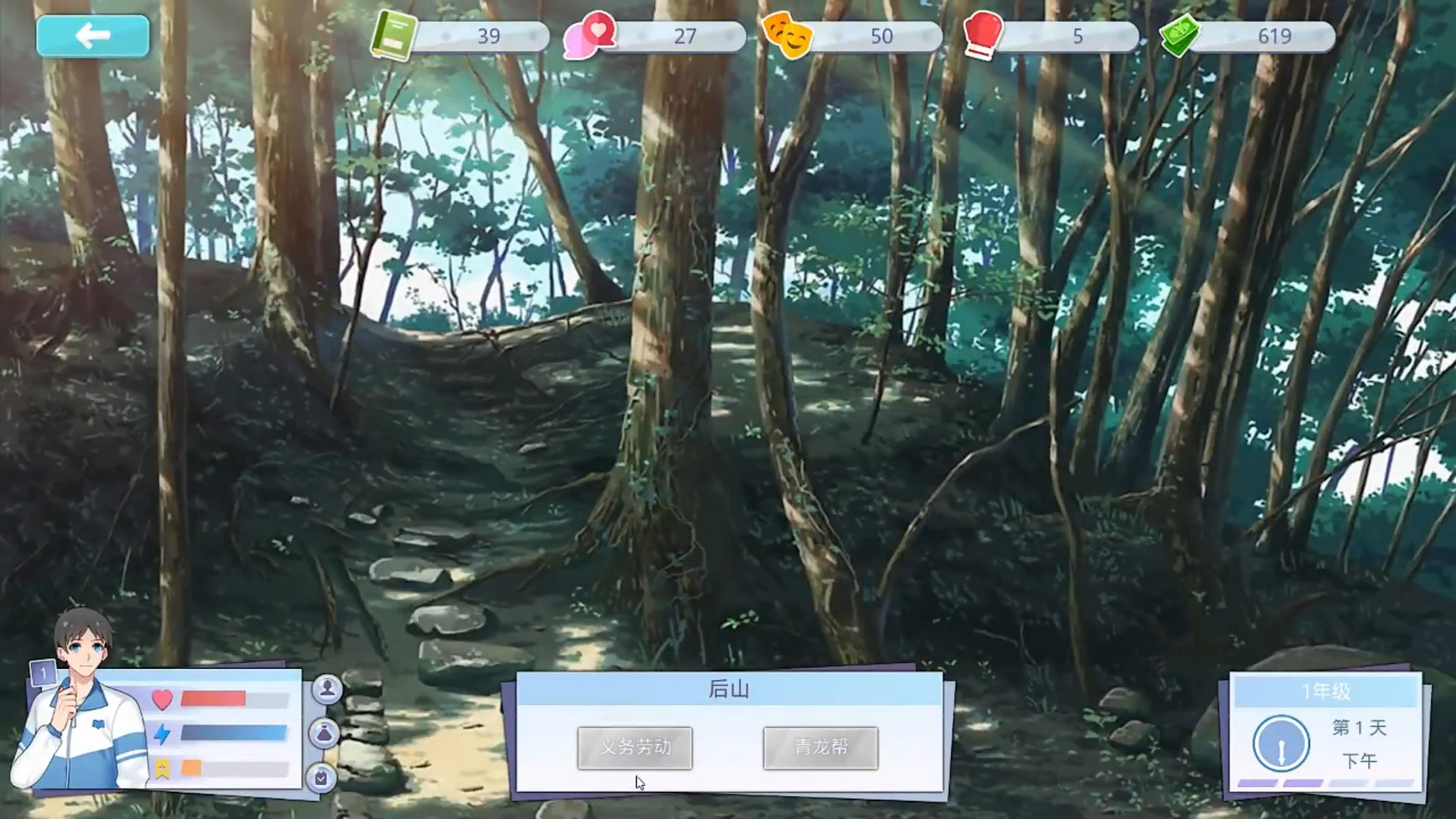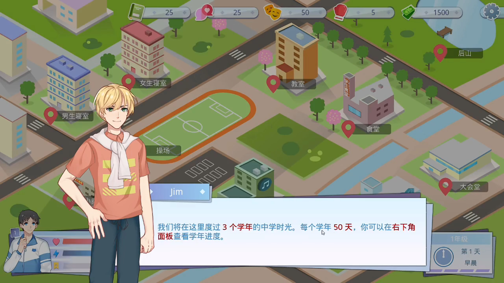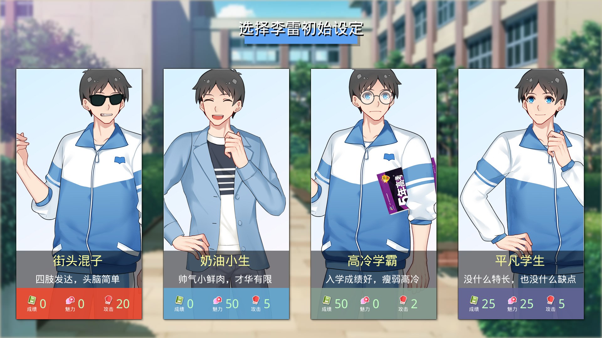然后人生就真的重开了,游戏正式开始,玩家一开始可以选择角色的初始属性,分别有成绩魅力攻击三种,攻击这一说法实在是太直白了,改成力量不好吗……,此外四种分类的立绘只有一丢丢的区别,给人一种在玩破产版XX暖暖的感觉。