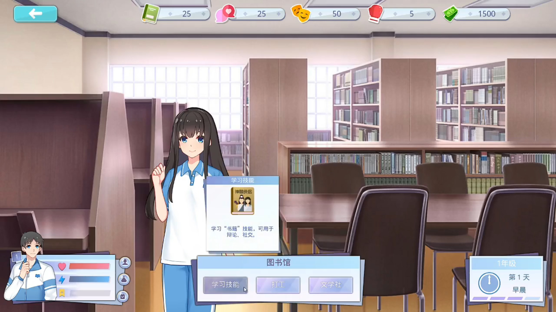 事实上离谱的还在后面,本作每个建筑的功能键十分紊乱,就比如图书馆,这个建筑拥有三个功能:学习技能,打工和文学社。
