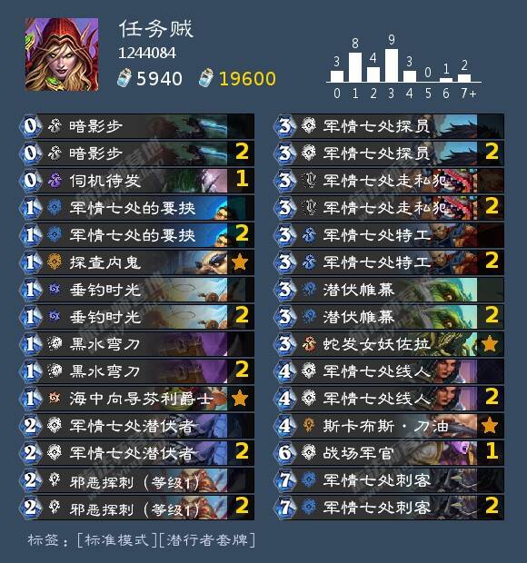 但是好消息是,任务贼和相关的核心组件并没有缺少,新版本完全有一战之力。任务贼是相对来说最不依赖过牌的卡组,而且早在上个版本任务贼的表现就非常强势,但玩的人却不多,属于是胜率不俗的冷门卡组(内战很少)。从上个版本开始我就主玩任务贼,基本每个月都靠任务贼上的传说,对任务贼这个卡组非常熟悉,经过更换新卡后,这个版本我也用这套新任务贼20把75%胜率上了传说,下面我具体介绍一下构筑和玩法。