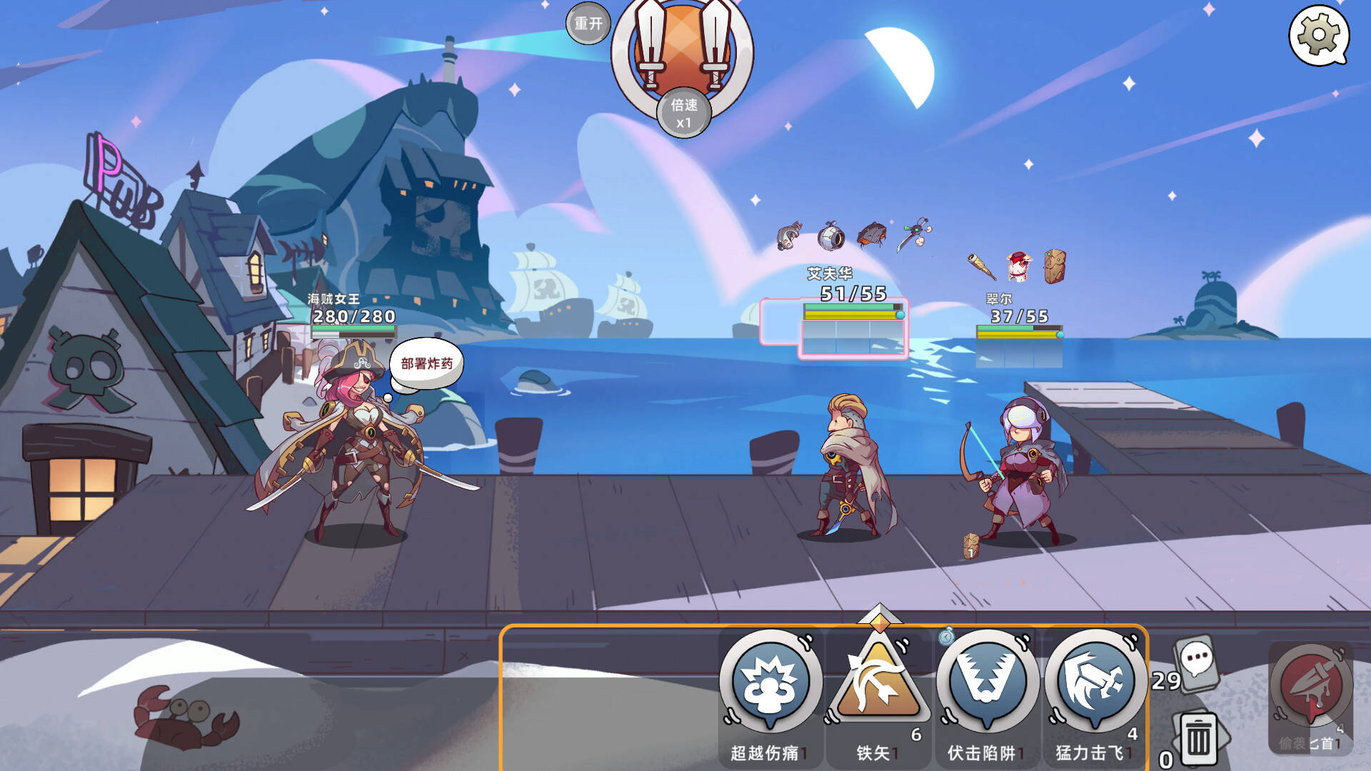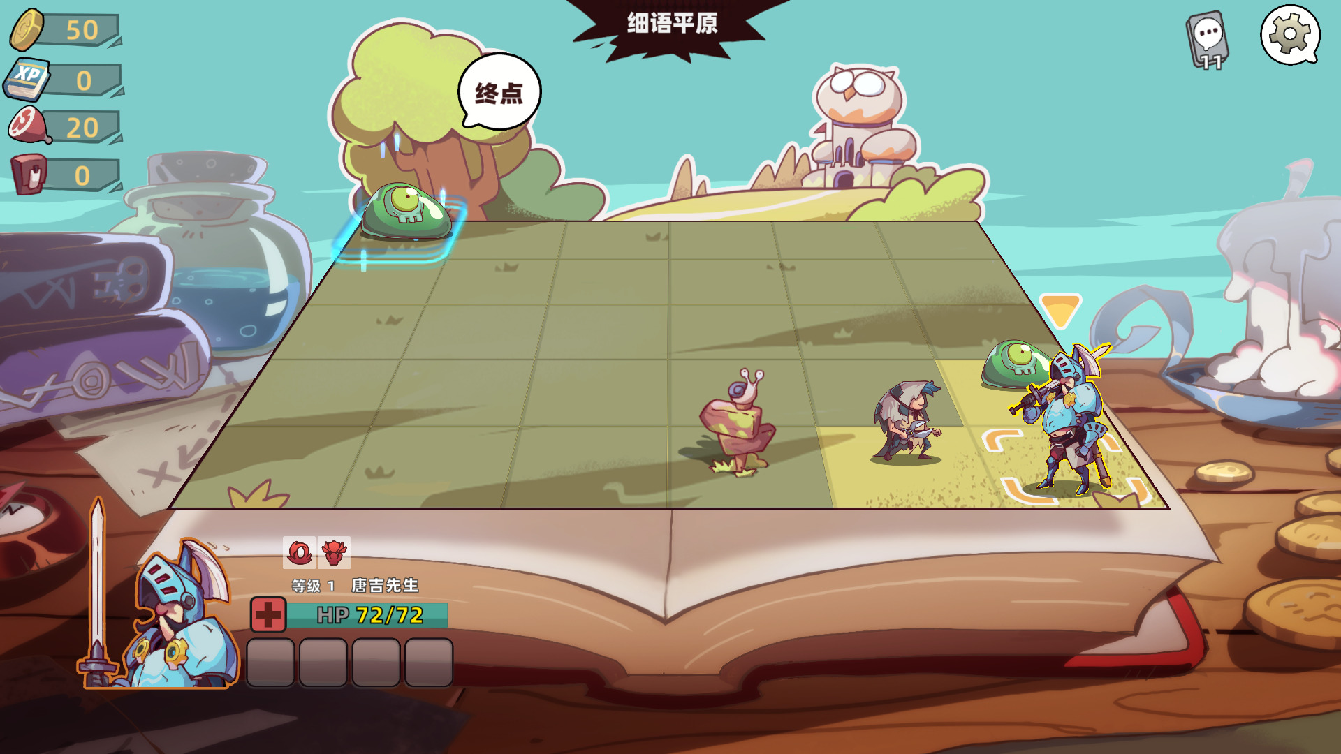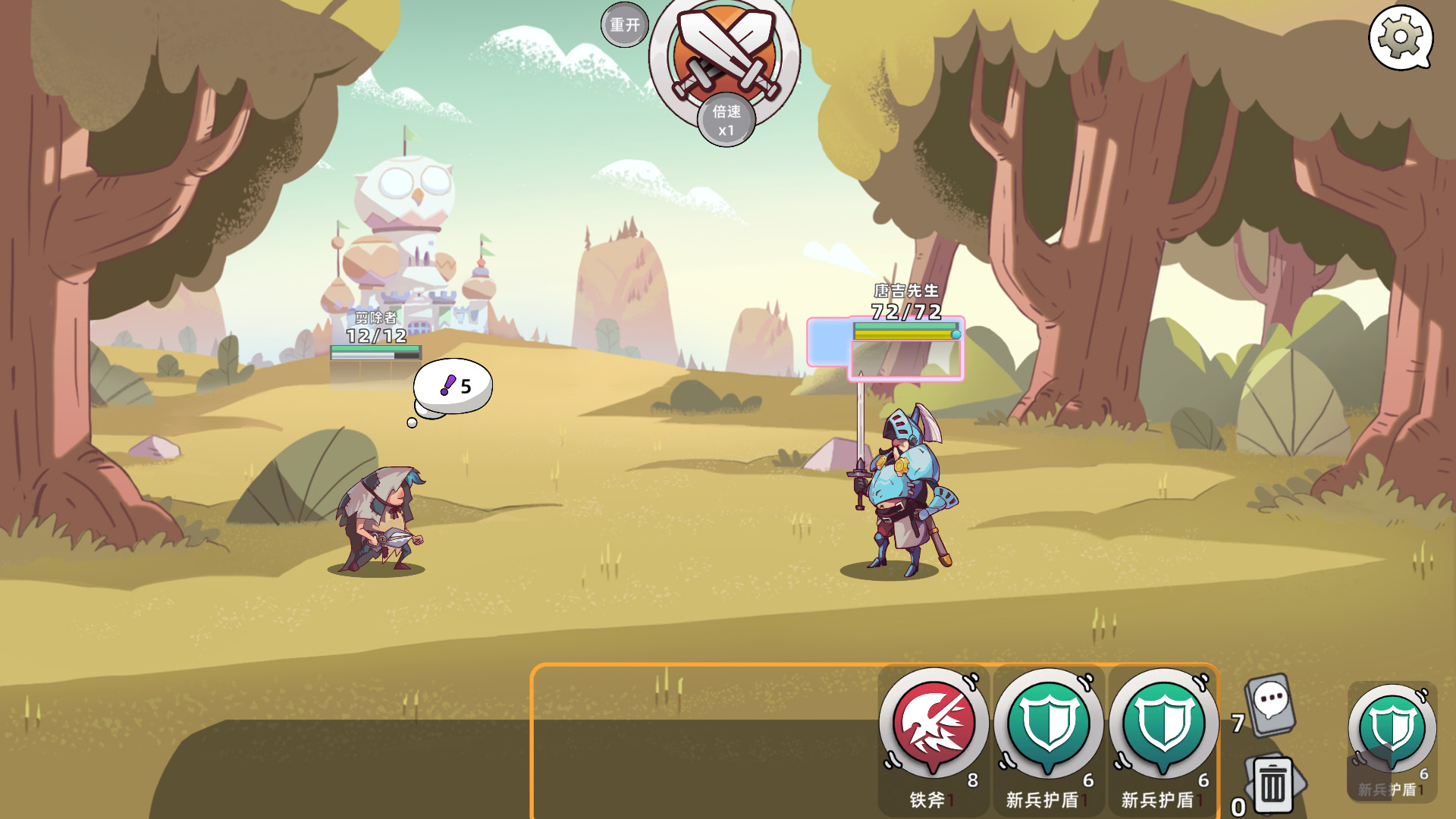 游戏的战斗罕见的没有设计成烂大街的“你拍一我拍一”的回合制,而是做成了即时回合制,角色的右下角会随时间获取随机的“牌”(虽然比较圆),同样敌人的血量下也有行动槽,一旦涨满便会对玩家发动进攻。