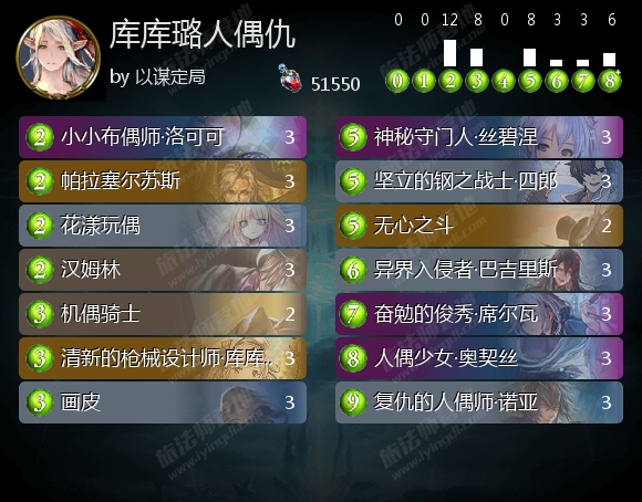 设计师表示:规则?就是用来打破的,DLC后,人偶仇不但没有削弱,还收获了清新的枪械设计师·库库璐这一强力新援。三费银姐拉库库璐的combo可以白吃对面二费随从,这对当年还处于你拍一我拍一的中速对局来说无异于降维打击,中后期爆能拉出的妹妹同样能参与蹭血。人偶仇彻底成为了前期节奏好,中期返场强,后期斩杀高,除了过牌拉胯外没有缺点的全能卡组。