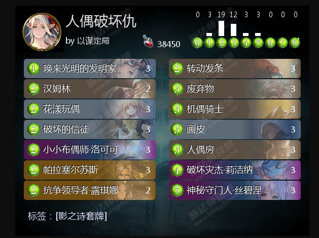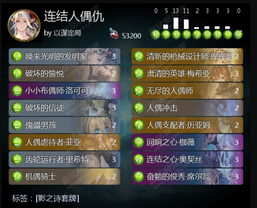不过,这套牌的缺点极其显著,二妹作为终端没有检索且必须绑定进化点,一旦来晚了就会直接丧失制胜手段,而且环境里的其他职业很多都会选择携带堕天来进行针对。因此,破坏仇虽然使用率很高(二妹太可爱了),但胜率上并不是一个能上大分的卡组。彼时人偶众完全沦为破坏体系的打工人,一个又一个悬丝傀儡发出刺耳的摩擦声,冲向眼前的敌人,但求一死,只为博得舞台上的偶像一展歌喉。