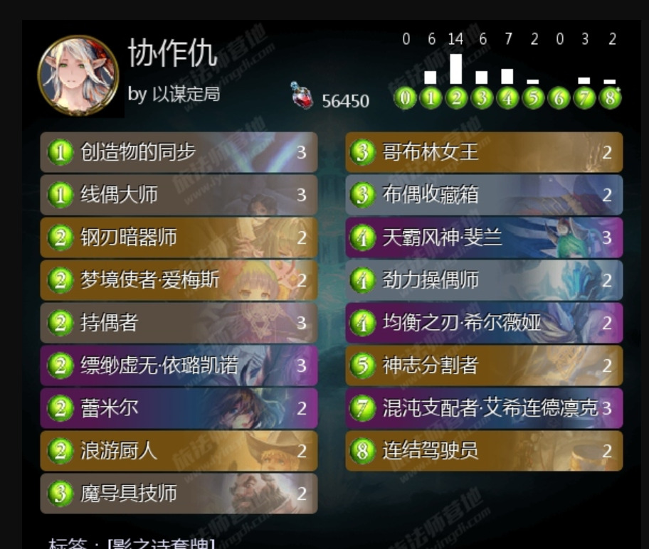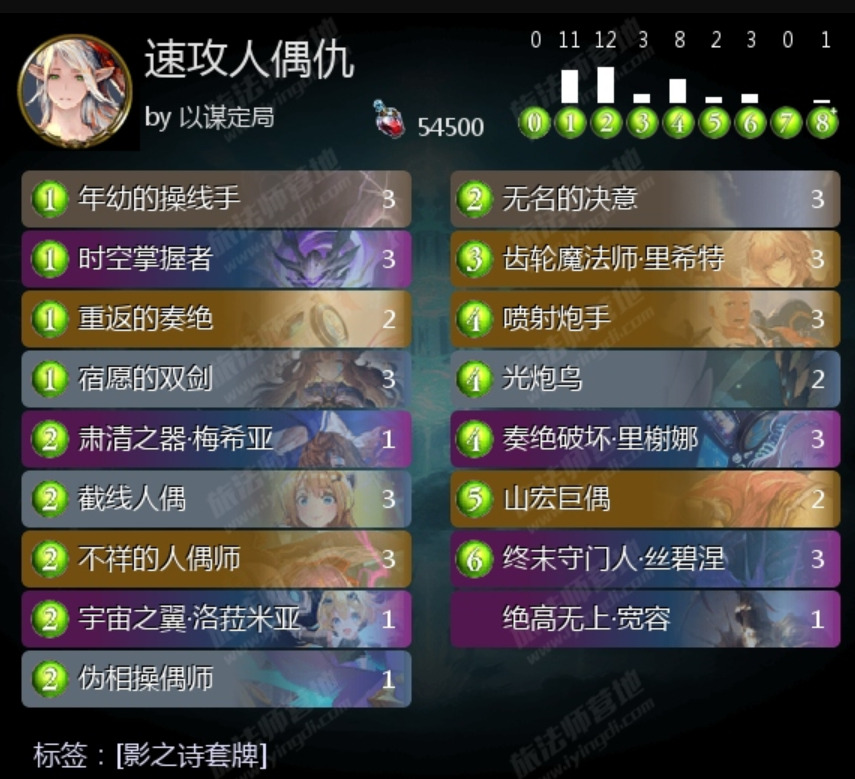 严格来说,这套牌其实混合了鱼丸人偶,造物,余费三家的优质铺场组件,并不算真正的人偶仇。但是人偶体系的卡在其中是绝对的主角。持偶者是唯一的二费二协作,线偶大师更是人偶体系从古至今的第一效率卡,一费三协作让人闻之胆寒。作为一张一费卡能够享受到“解不掉XX的都怎么了”之待遇,超模程度可见一斑。