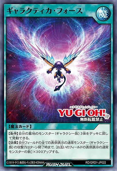 【效果】自己场上的全部的表侧表示的通常怪兽(银河族)的攻击力直到回合结束时上升[双方场上的表侧表示的通常怪兽的数量]×300。