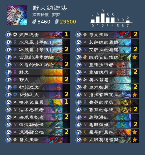 我对这套卡组的理解是,起手尽量留法术+纳迦的组合,只有法术+纳迦的手牌才能源源不断的运转。这套卡组的优势是有两波爆发铺场,3张站解一体的牌,续航也是几乎远远不断;缺点是没有回复。