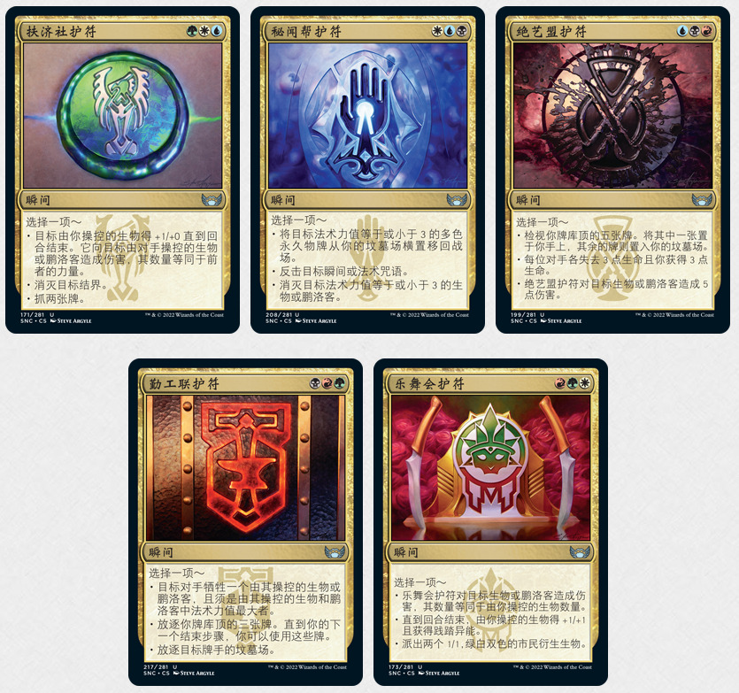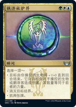 在最后发行和测试中大部分的版本上,模式的顺序都是依照出现在法术力费用裡的顺序。以扶济社护符来说,第一个效应是绿色效应,第二个是白色而第三个是蓝色。第一版本的设计很好地展现了你希望在设计中有的广度。绿色的异能属于强攻且聚焦在生物上,白色的提供了一些潜在问题的因应之道,蓝色则给你一个可以控制节奏和暂时回应威胁的工具。特别是这张牌还提供在你有不只一张时的组合技。蓝色效应可以锁死生物让白色可以消灭(通常在三色护符裡,多张之间所产生的组合技比较不会被当成顾虑)。执得一提的是这三个异能没有任何一个留到了最终版本或是其他任何护符上。