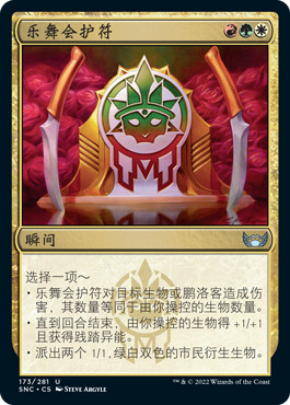 然而,这正是让这张牌变得一团糟的地方。所幸,他们在最终印行的版本上找到了解决的办法。红色模式是基于你操控生物及鹏洛客数量的伤害,绿色模式是提供了绿色关键字的灌大生物,而白色则是派出衍生生物。这裡有趣的是这是唯一一张,其中一个颜色—白色—几乎可以完成所有的模式的护符(除了提供践踏这点办不到以外)。