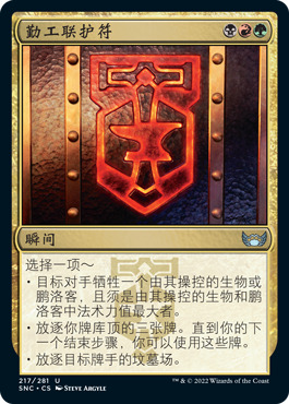最后,他们决定如果没办法同时用上所有的色组机制,那不如全部不用。蓝色的异能是环境裡需要有的东西,但那个效果被从蓝色移到了绿色并被放在勤工联护符上(并调整了绿色要如何使用的方式)。
