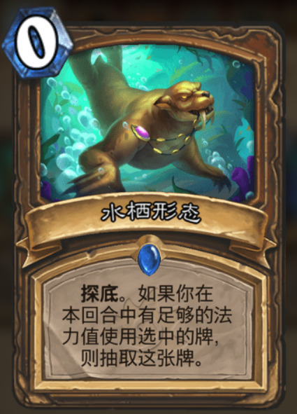 新版本中的【水栖形态】让德鲁伊加强不少,探底加抽牌让卡组流畅度极大提升,更容易找到Key牌和comb 组合,如果说【月光指引】相当于二姐夫,【水栖形态】则相当于三姐夫,所以在德鲁伊卡组中成为必带卡牌。