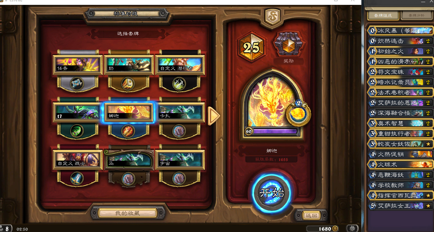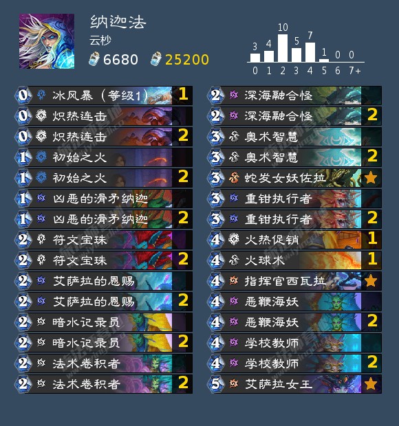 在新版本到来后,我便从十星开打,在天梯一直尝试各种纳迦法的构筑,最终敲定了一套携带火球术与火热促销的纳迦法卡组,并用其以300多场超过60的胜率打到最高传说25名。