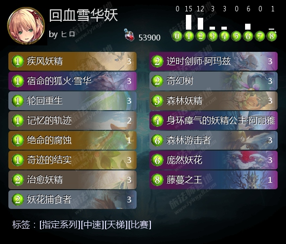 目前的雪华妖构筑趋于统一,普遍投入藤蔓之王以增加后期上限,携带绝命的腐蚀或受妖精指引的弓箭手等前期过渡牌,以及11张以上回手组件,包括能高效回血的治愈妖精。她能与奇迹的结实、树、森妖一同大量回血,针对抢血思路,为凑齐雪华斩杀争取足够的时间。