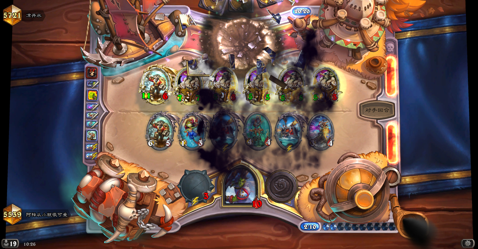 打海盗战55开,这个对局主要看2+0是否在前期上手,英雄牌是否在中期到位,如果能处理好前期场面,血量压力不大的话,比对面晚两个回合开船也没什么问题,两边都开船之后英雄牌能及时叠10甲并提供稳定回复,慢慢就能打回优势。