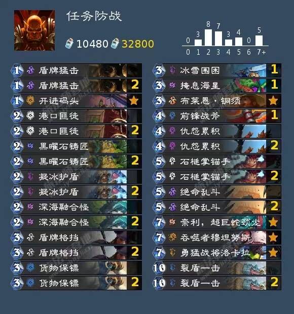 防守体系:2+10,不用说,防战必带的最强combo,2费a5刚好处理纳迦法、快攻瞎的所有场面。仇怨累积,最近几天瞎子胜率出场率暴涨,这张卡刚好处理穴居人、邪犬、222生仔的场面并且叠甲,打瞎子的mvp单卡。盾牌格挡,叠甲加过牌,好牌。盾猛乱斗不用解释。最后讲讲为什么带了一张冰雪围困:这张卡打德鲁伊有奇效,首先前期一地小海盗面对对面准时的奇迹生长当斩杀用,可以过墙,然后中期乱斗没上手的时候可以拖一回合处理森林之王或者巨人,并且在10费时(巨型吃了沉默之后)面对一地巨人可以冰冻+吃手手搏一手吃卡扎。英雄牌,登场叠10甲,配合裂盾一击,后期技能打瞎子猎人还能持续叠甲,用过都说好。