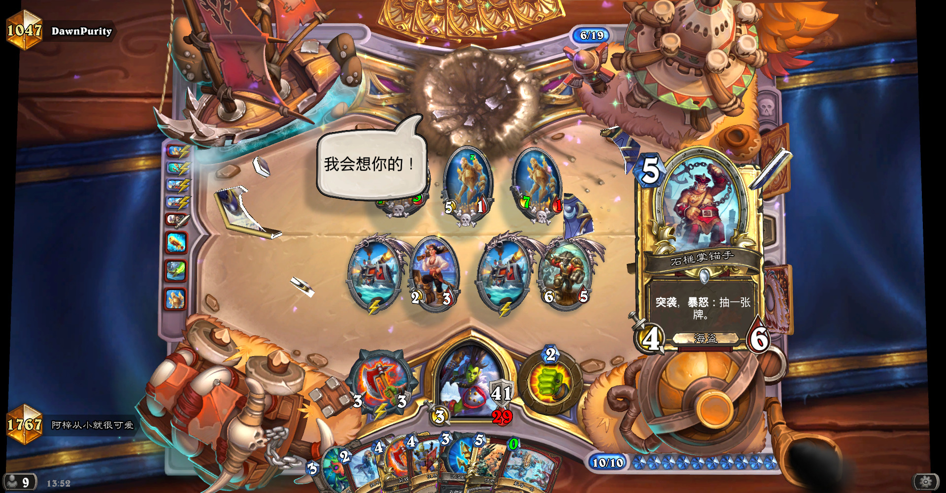 打跳费德的思路就是起手找低费海盗(可留融合怪)快速过牌做任务,争取在对面挖宝之前铜须开船,如果做不到,节奏优先,只有一艘船也要下,然后靠优质解牌处理对方的大哥。这个对局我打了太多,有很多细节,下面慢慢讲: