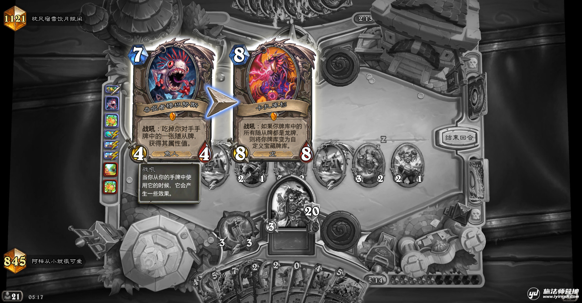任务猎也是我们的劣势对局,主要在于我们任务没对面做的快,完成任务那两回合场面和有血量双重压力。确认是任务猎的话,我是起手留吃手手的,前期不破爆炸,在对面试图留一个控进度的时候破掉爆炸然后吃手手还是有机会的。除了吃任务奖励之外,牌序好,叠起大量护甲而对面断牌也是有机会赢的。这个对局刚好仇怨积累没什么用,中后期可以解掉自己的2血海盗避免成为对方灭龙射击的靶子。如果对面二阶段变身的话反而有点优势,因为把直伤转化成了场面,而我们处理场面的能力很强动物伙伴刚好是4血和2血,利用船的炮、仇怨累积和变身技能清场叠甲,然后武器打脸有可能先带走对面。
