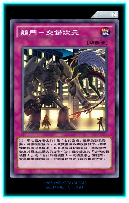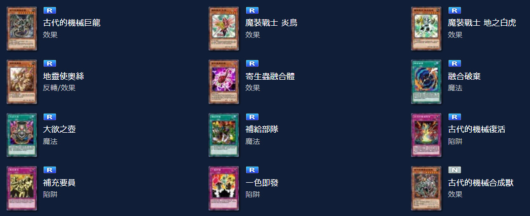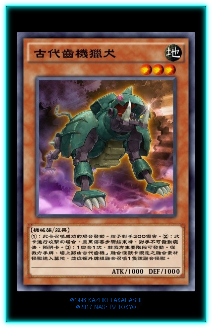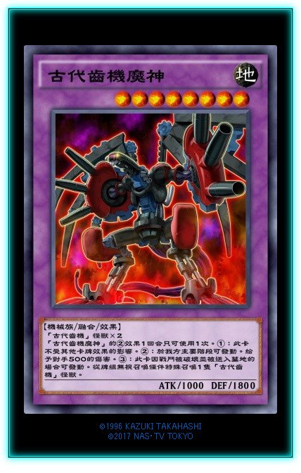 古代的机械全新融合怪兽,出场条件简单,拥有无敌的全抗性,但是攻守数值极差,非常容易被战破,还好被战破有个遗言效果,能从卡组拉古巨人、究极重击或者是热核龙。