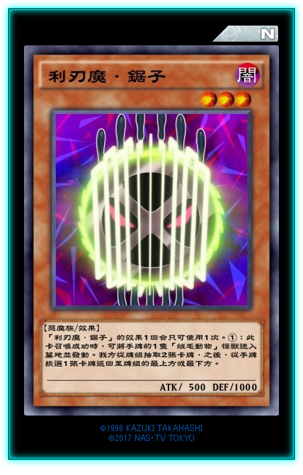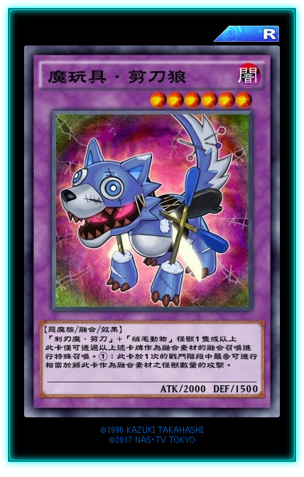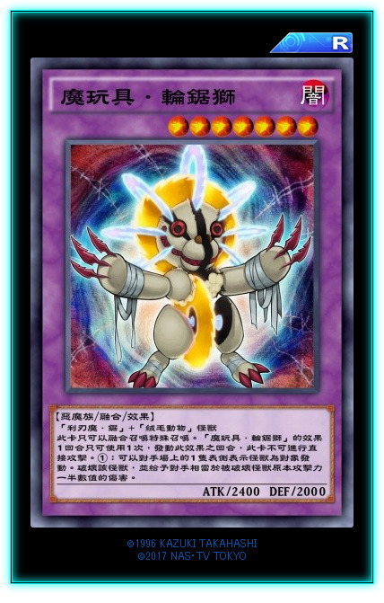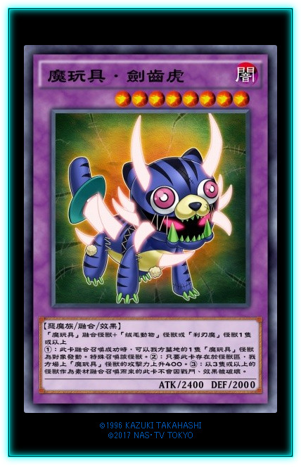 魔玩具的强力终端之一,保底2800攻击力,用三只怪兽做素材融合出场的的话,会获得效破和战破抗性。可先融合出剪刀虎解场后,再用剪刀虎做素材融合出锯齿虎,锯齿虎拉剪刀虎,互相buff获得各700攻击力的加成,完成OTK。