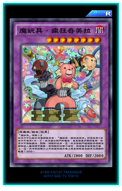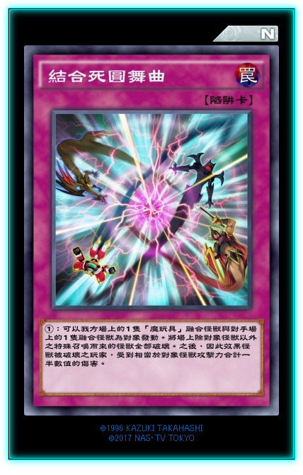 这张卡的效果非常拗口,我看了3遍才看懂。。。简单来说就是选择我方场上一只魔玩具融合怪兽和对手场上一只融合怪兽,然后把这两只以外的所有特殊召唤来的怪兽全部破坏。最后,如果你的怪兽因为这个效果被破坏了,那么你就吃效果伤害,伤害数值为最开始选择的魔玩具融合怪兽攻击力数值的一半。同理,如果对手的怪兽也因为这个效果被破坏了,他就吃效果伤害,伤害数值为最开始选择的他的融合怪兽攻击力数值的一半。双方吃效果伤害是同时处理的。可以理解为各自吃伤害保一怪,但是前提是对手也得有融合怪兽。