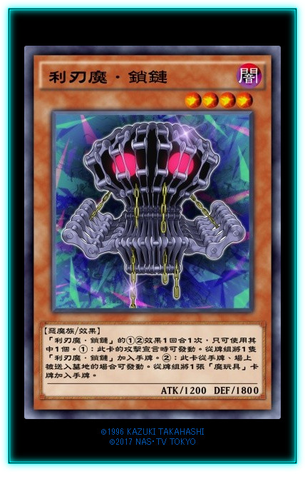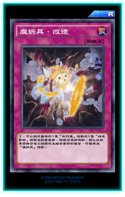 魔玩具本家另一张核心卡,①效果基本用不到,②效果一般用其他锋利小鬼或者玩具罐堆墓来触发。也可以作为融合素材从手牌或者场上送墓来触发检索效果。