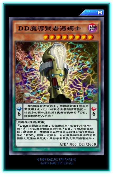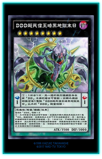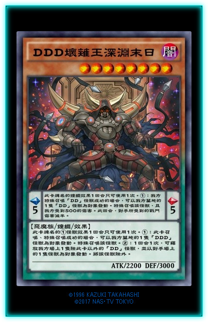 椅!子!王!他!来!了!DDD的第一张登陆也是目前唯一登陆的椅子王。刻度一般,要配合高刻度的开普勒才能摆本家的CEO,麦克斯韦,皇帝等高星大哥,灵摆效果还不错,特召一个DD,再拉墓地一个DD,虽然要掉500血。怪兽效果那可太厉害了,①效以外的果特召成功拉墓地一只DDD怪兽,②效果,一回合一次,解放我方场上一只此卡以外的DD怪兽,除外对手一怪。DDD玩家真的是狂喜啊!!!