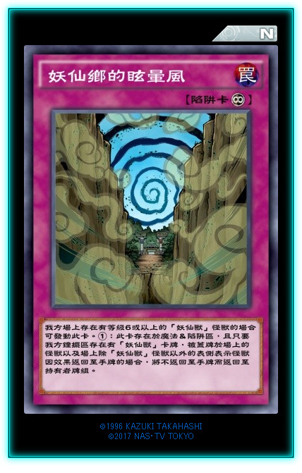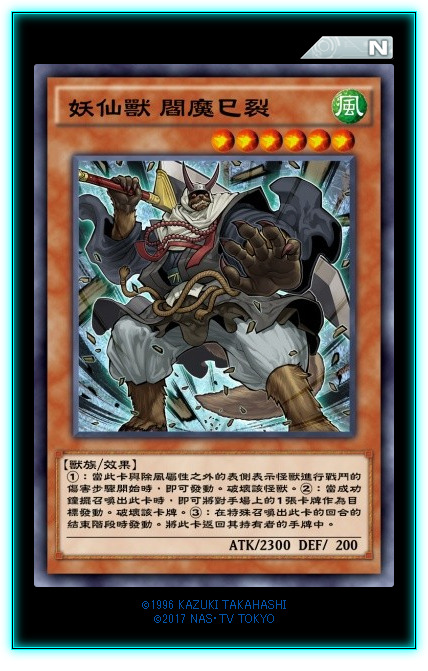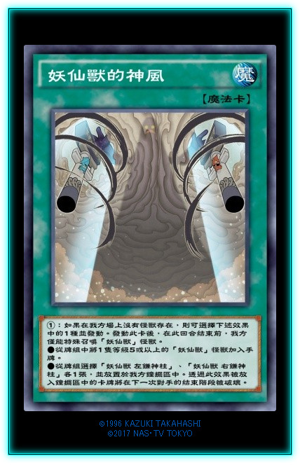 妖仙兽卡组的上级检索,可用来检索独眼群主或者大刃祸是。检索完可以直接用另一个效果直接开摆,而且开摆的副作用可以直接通过独眼群主和大刃祸是的效果规避:直接把拉出来的左右柱子吹回手牌,啊,这还不是最无赖的,最无赖的是这卡没有卡名一回合一次的发动限制,啊,太恶心了啊!!!