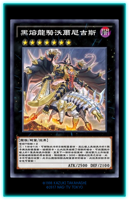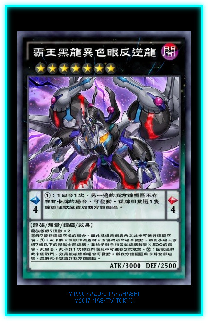 本次卡盒的封面怪兽,番茄的王牌怪兽【异色眼灵摆龙】的超量马甲之一,DL第一张额外灵摆怪兽。此卡正规出场后可以被灵摆召唤,这就是一个解除苏生限制的问题而已。此卡的①效果非常强力,用超量怪兽作为素材来超量召唤此卡的场合,可以破坏对手场上所有等级7以及以下的怪兽,每破坏一只,烧对手500血(这效果伤害要是没减半,在DL里,估计霸黑一出场对面就可能已经死了),并且这回合,这张卡可以攻!击!三!次!不是攻击对手怪兽三次哦,是攻击三次哦!!!
