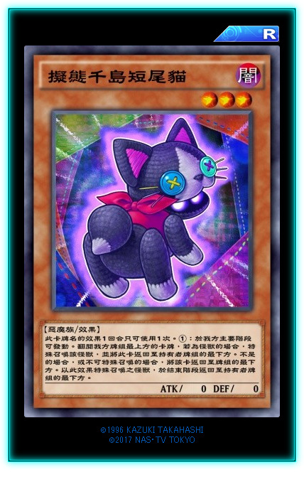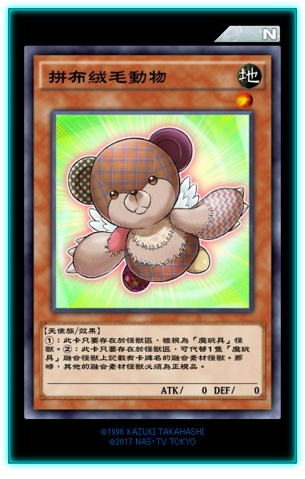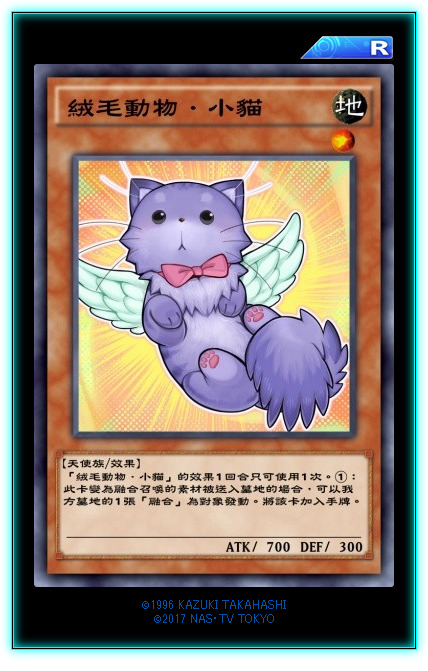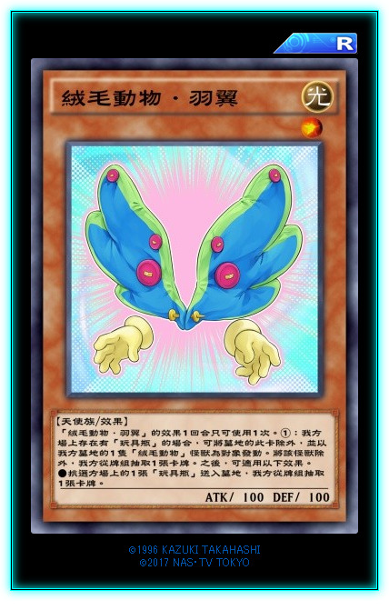 小猫没啥用,只能回收魔法卡【融合】;翅膀可以赚卡:熊检索玩具罐,玩具罐发动丢弃翅膀,抽到绒毛动物就特召,抽不到就堆墓。然后除外墓地的翅膀,发动效果除外墓地的熊,抽1卡。再根据效果把场上的玩具罐送墓,再检索一张【锋利小鬼】或者【绒毛动物】怪兽。稳赚2卡,如果堆墓的是锁链,还可以再赚1卡。