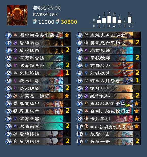 下面这个是依旧带卡杉构筑的防战,带了上限一套深海来客+芬利探底。加上防战本来就会带的奥妮克希亚幼龙+两个融合,就可以触发挖宝了。为了能稳定一些检索到两个融合怪,还带了一张鳄鱼人掠夺者定向检索。之前日报也提过防战的铜须配合学校教师能带来很多质量,尤其是找的好能叠巨量护甲,第二套厚度是无敌的,就是可能会被抢死,因为随从带的稍微太多了,前期的解牌很依赖小学生找到合适的。