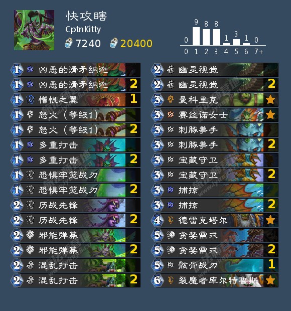 这张卡就是我感觉恶魔猎手现在最赖皮的卡,评价德的时候我会觉得一套跳费卡组不能又有突袭解场又有回血还能后期无敌的资源能力,评价现在的恶魔猎手我是一个感觉,作为一个快攻你不能又轻易过掉我的嘲讽还能打出巨量的伤害,现在的恶魔猎手只有用防战抓是最稳的,我查了一下我奶骑打恶魔猎手的战绩也就18-10,经常被抢死,不变身凯瑞尔的情况下他能摸到一个贪婪需求补上手牌就能用恐惧牢笼战刃配合这个多重打击轻松打出单回合10+爆发伤害,加上前期蹭的血,竟然被抢死,这个卡我感觉甚至比之前的双刃斩击还强,要动就是这张了。