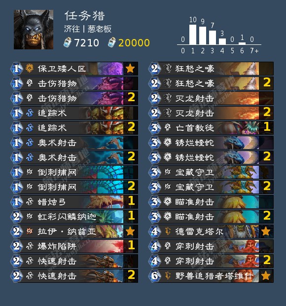 补丁后任务猎最大的构筑特点就是单爆炸+单蜡烛弓。我遇到的那些任务猎都这个构筑,为了打一下恶魔猎手这个对局选择带上了一些针对牌。玩法整体和之前一样,前期用怪推抢血,做完任务用英雄技能配合直伤获胜。上面贴的卡组带了一张亡首教徒,是为了打恶魔猎手这个对局的。又是嘲讽又带回血。