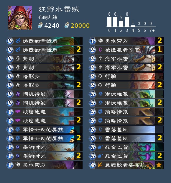 潜行即无敌,而且还能触发效果前打脸2,有多余费用/需要触发连击直接拍,除了不能配合安布拉没什么缺点,为什么只带一张是因为我只有一张,也够用,因为是随从起手不留