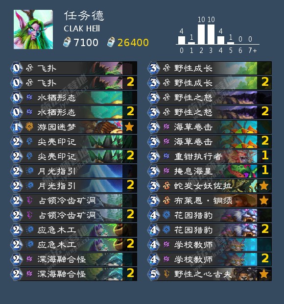 这个卡组因为纳迦带的有点多,没法带科技跳费牌,所以就非常吃古夫的上手率,只有古夫变身之后跳起科技才能在后期打出任务奖励古夫+佐拉+铜须等一系列上限操作。前期就是老实做任务看看能不能在这个过程中稍微蹭一下对手的血量,完成任务后用古夫的直伤斩杀对手。这里还有一套任务德卡组我觉得可能合理一点,大家可以选择一个玩的顺手点的。