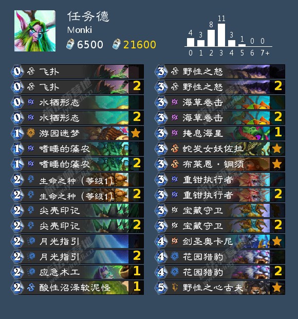 Funki Monki使用这套牌打出了16-2的战绩。因为新卡海草卷击需要纳迦触发,所以卡组构筑上得围绕一些纳迦属性,不过卡组选择的都是万金油搭配,嗜睡的藻农的解厂牌,宝藏守卫和重钳执行者是优质三费生物,前期不仅能混住场面而且能过牌,佐拉可以在后期配合铜须收任务奖励古夫。