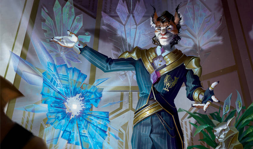 角落裡有两位狮族保镖,他们的黄铜雕刻眼镜映射著紫光,宛如垂挂穿越酒廊各个角落的液态绳索。保镖毛茸茸的耳朵朝佩力抖动了一下。他们看起来放鬆但谨慎。