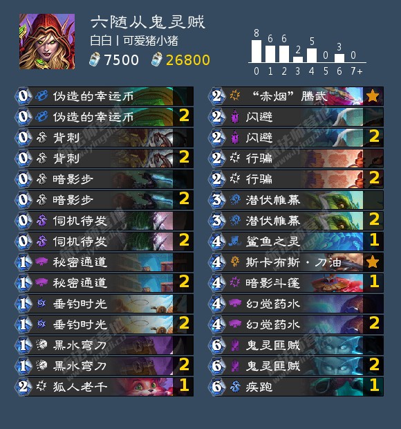 这是一套非常阴险的鬼灵贼,只携带6个随从,垂钓时光、秘密通道、行骗、潜伏帷幕多重抽牌加持,让凑出6张key变得非常轻松,对于没有脏鼠的卡组来说是非常致命的。即便被脏鼠了也有机会出幻觉药水。幻觉药术也经常会近似当作刀油来用,熟悉药水的鬼灵玩家会更得心应手。由于鬼灵最怕的暗牧被剑鱼贼打没了,所以这算是应对环境改变而作出的构筑调整。