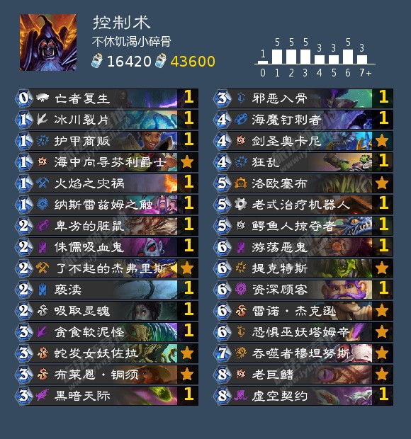 自认为比较亮眼的就是5条鱼,鳄鱼人掠夺者作为润滑剂非常舒适,442绽放鱼+7/8费鱼能提前腐蚀688。恐惧巫妖塔姆辛在对阵快攻时后手可以留下。