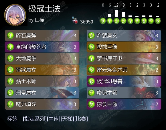 在前期,土法能通过结晶禁书库守卫、废墟术师,以及碎石魔弹、黏土术师、强欲魔女、炸裂魔女、魔力填充快速堆叠蓄积数。到了中期,除了通过进化强欲、雷云炼金术师进一步堆叠蓄积以外,土法还能利用扫帚魔女的谢幕曲,酸蚀巨像、极冠幻想兽的进化效果,在吃土的同时重新补充蓄积数,形成良性循环。而在堆够7个已消耗蓄积数后,卓绝的契约者便能召唤4/4疾驰,非常高效地抢血,乃至配合酸蚀、**魔拳等高伤组件完成斩杀。