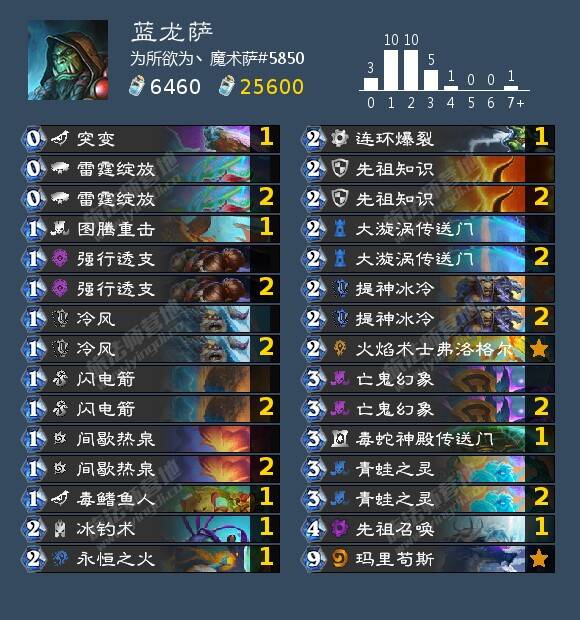 4. 突变:有很多老哥问我为什么要带突变。突变可以作为0费法术配合蛙灵滤抽1费法术,在必要的时候可以把蛙灵变掉防止爆牌(注意,打出突变的同时蛙灵还能过一张牌)同时巩固场面(4费怪一般情况下还比较能打)。在萨满所有0费法术里突变和蓝龙萨的契合度是仅次于雷霆绽放的。可能可以用图腾潮涌代替,看个人喜好。