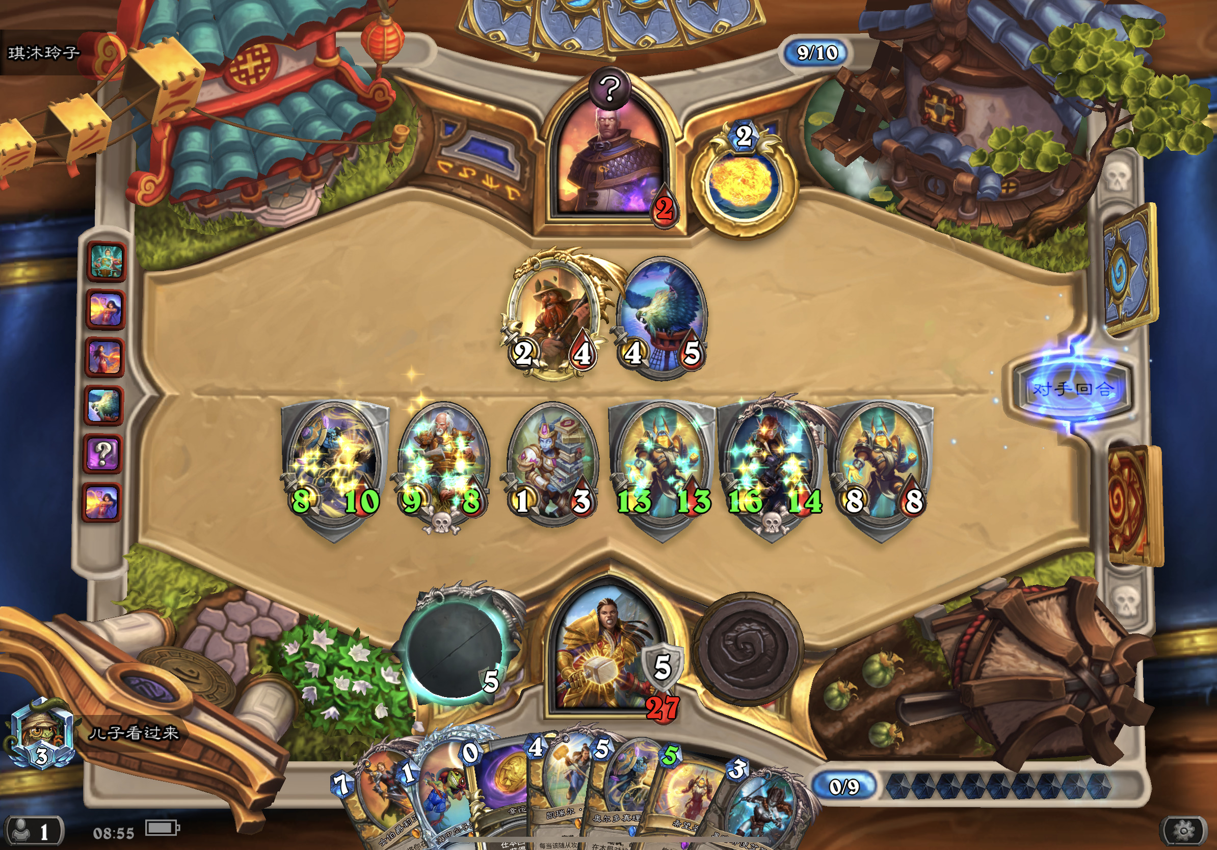 这个对局我认为要用猎人的思路来看待,再用随从蹭血的同时,要计算自己已经握有的伤害量,并且清晰自己牌库中可能有的斩杀牌,来做出适时解场的决策(我们大多数随从攻击力很容易涨到五点以上,一味的打脸很容易被解光。