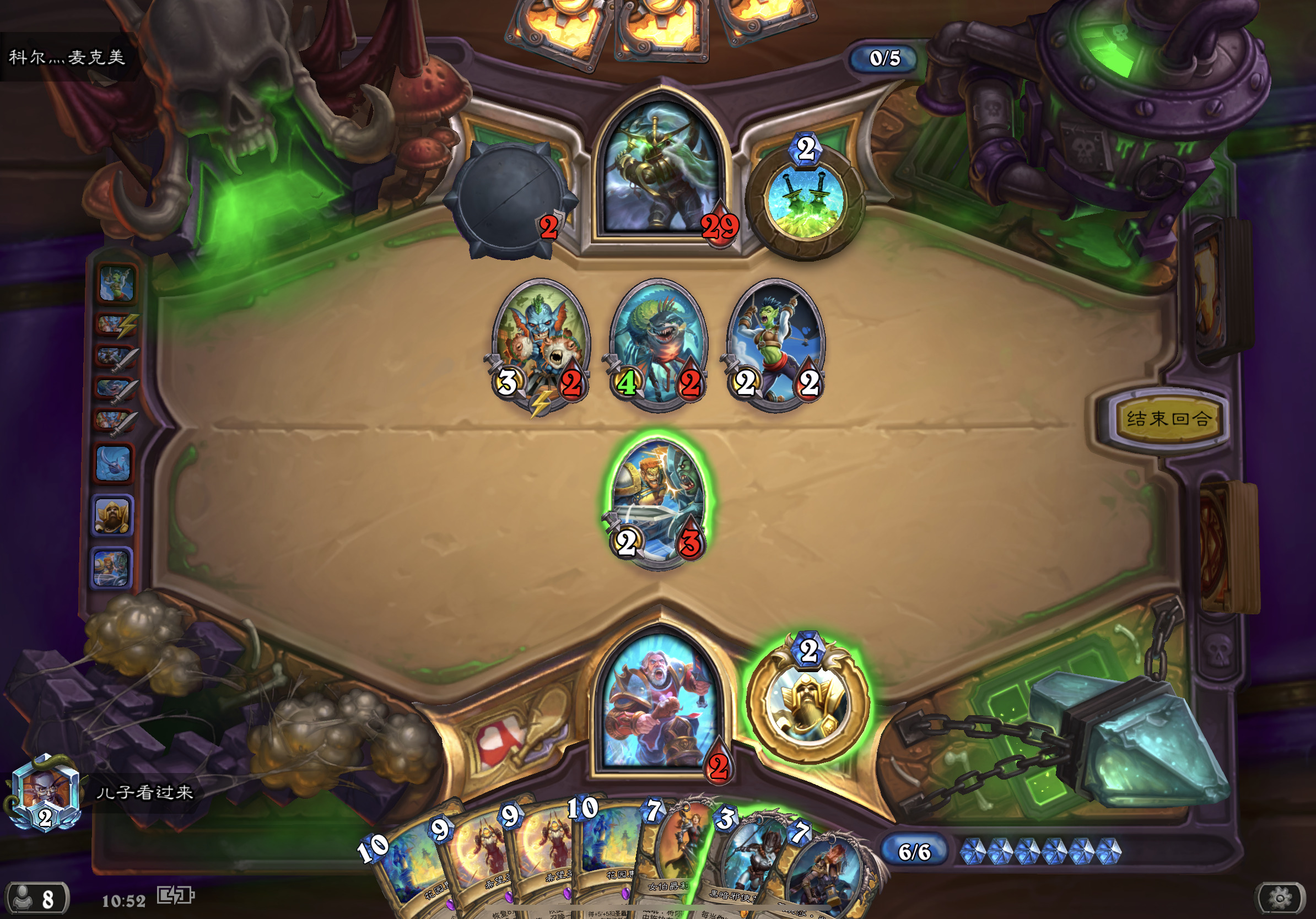 这个对局值得一提的是要注意修血,我们大部分解牌都是在一血左右徘徊,用一攻随从给2血随从修血比直接解掉一个1血随从赚的多。