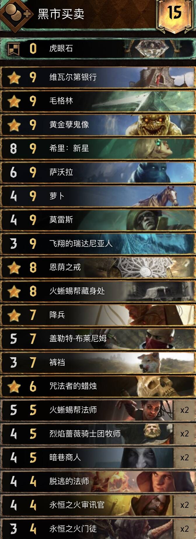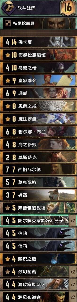去掉了毒改成了火誓者的铜卡体系。更契合孽鬼湖女剑的高节奏,萝卜裤裆鬼船加孽鬼可以滤干牌库,缺点就是控制力减弱了,鬼船有可能内鬼跳不出来,需要骷髅头加领袖或者先手优势才能开,钱一般随赚随花,只要留给莫雷斯和萨沃拉就行,降兵适合这个版本,矮人、精灵、罗盘岛甚至北方都很吃aoe,如果觉得控制不足可换成乱斗或者小丑。