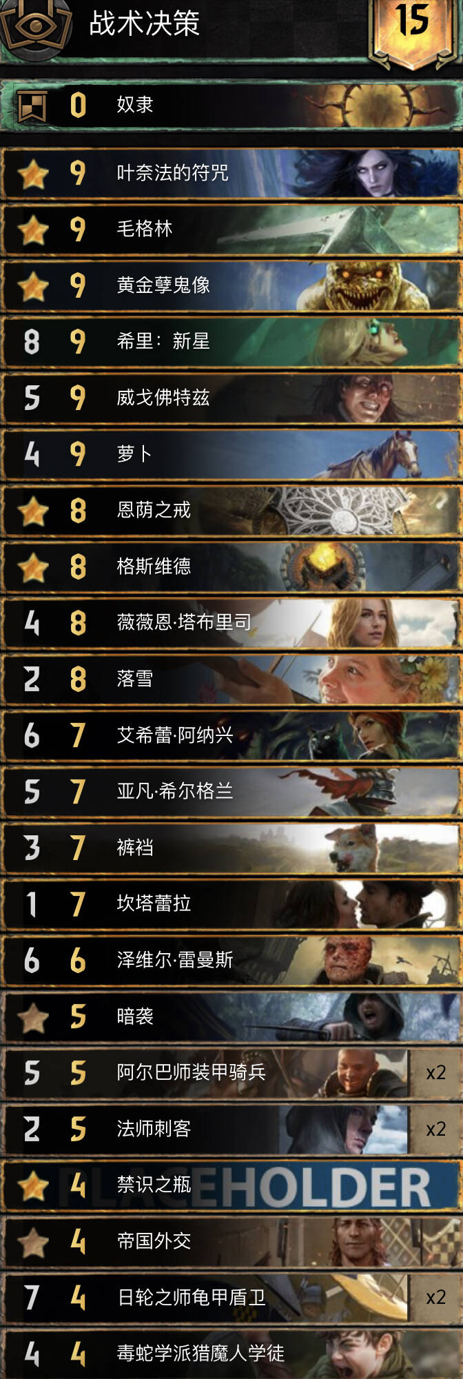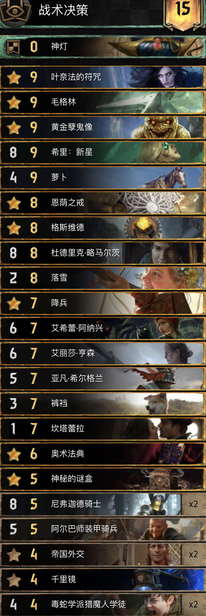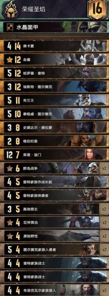 第三过分的恶卡是北方4p调度铜卡,4p3点每次调度+3,对局一把完美调度起手换2次+领袖2次+小光头2次+落雪洗牌鸡2次+抽牌猎魔人3次+行脚商人2次,也就是13*3也就是39点最大值点数,当然正常对局平均调度点数大约在21-24左右,4p24的身材已经够离谱的了,配合崔丹姆和巨魔魔加倍,我在几把调度北对局中r3拉点差拉到了六七十多点,被后手调度追了超过50点,这个模型爆炸程度建议把戈多删了,除帝国外其他阵营几乎没有反制手段(迪迦有个无赖定向检索,群岛只有熊老大可防,中立拉牌全都是随机的)这个卡组最离谱的在于,核心卡全在4p,意味着上面的卡池想带什么带什么,你甚至可以再带一整套围攻或者战灵完全不影响构筑。