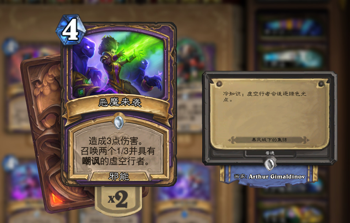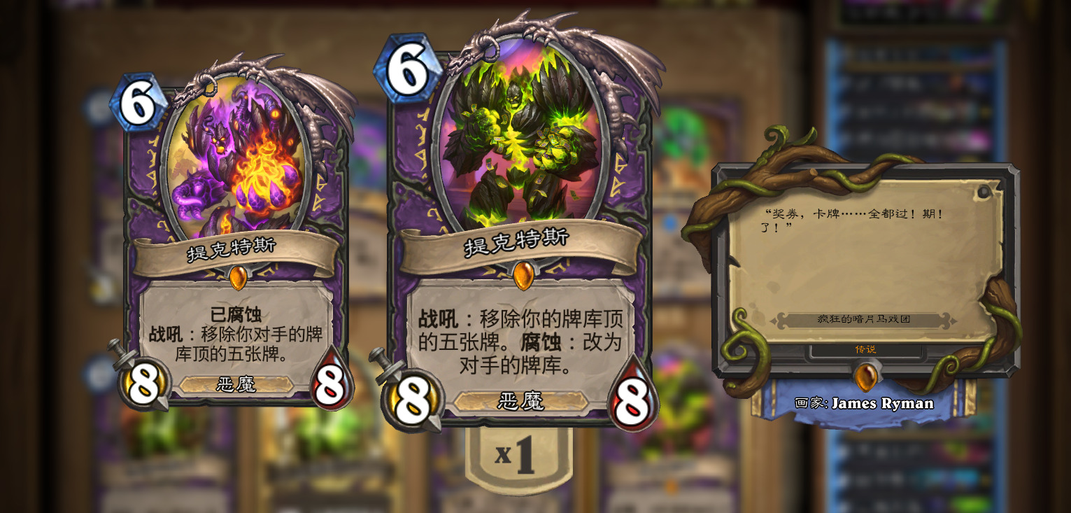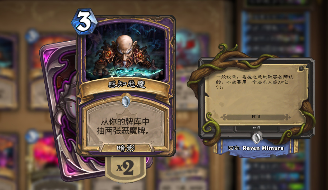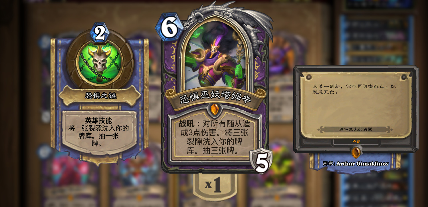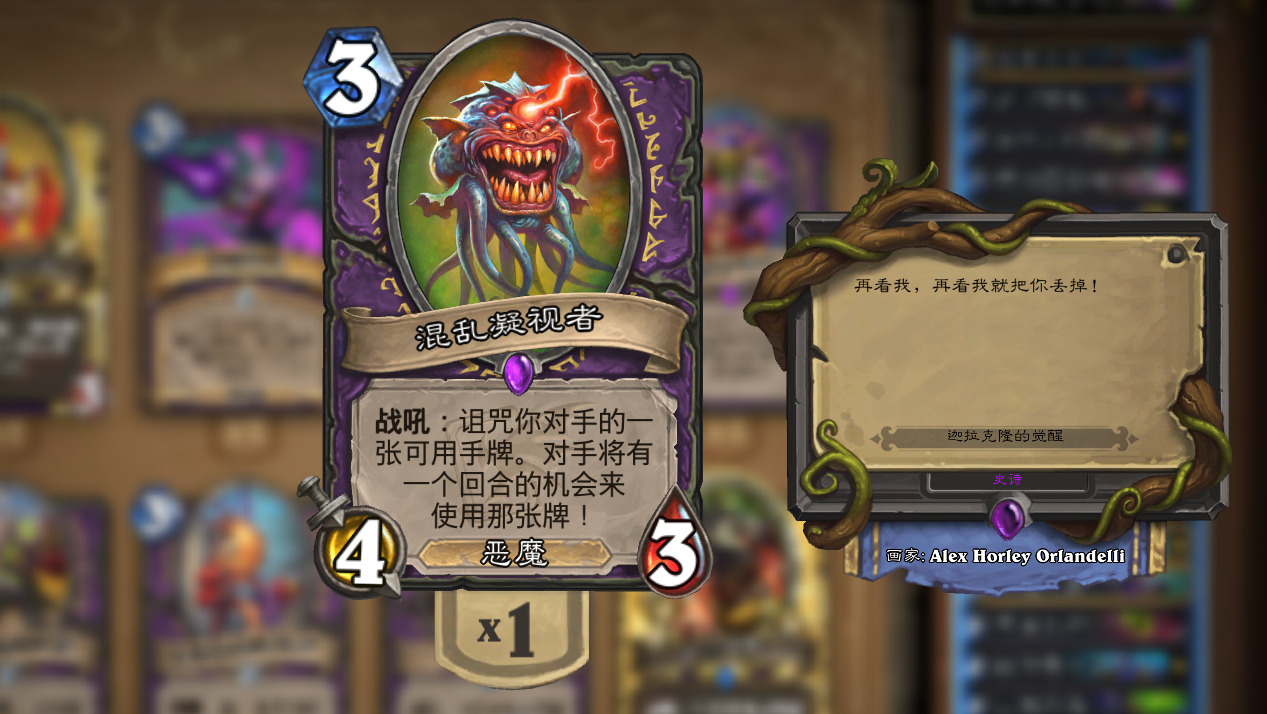 提克特斯肯定是越早打越好所以加了一个恶魔体系 混乱凝视者有几率射到大灾变刀油毒鱼等关键卡 稍微提升一丢丢otk抗性 感知恶魔给小鬼也不是不能接受 能破剑圣 能给亵渎凑1 能给顾客 biubiu增加伤害