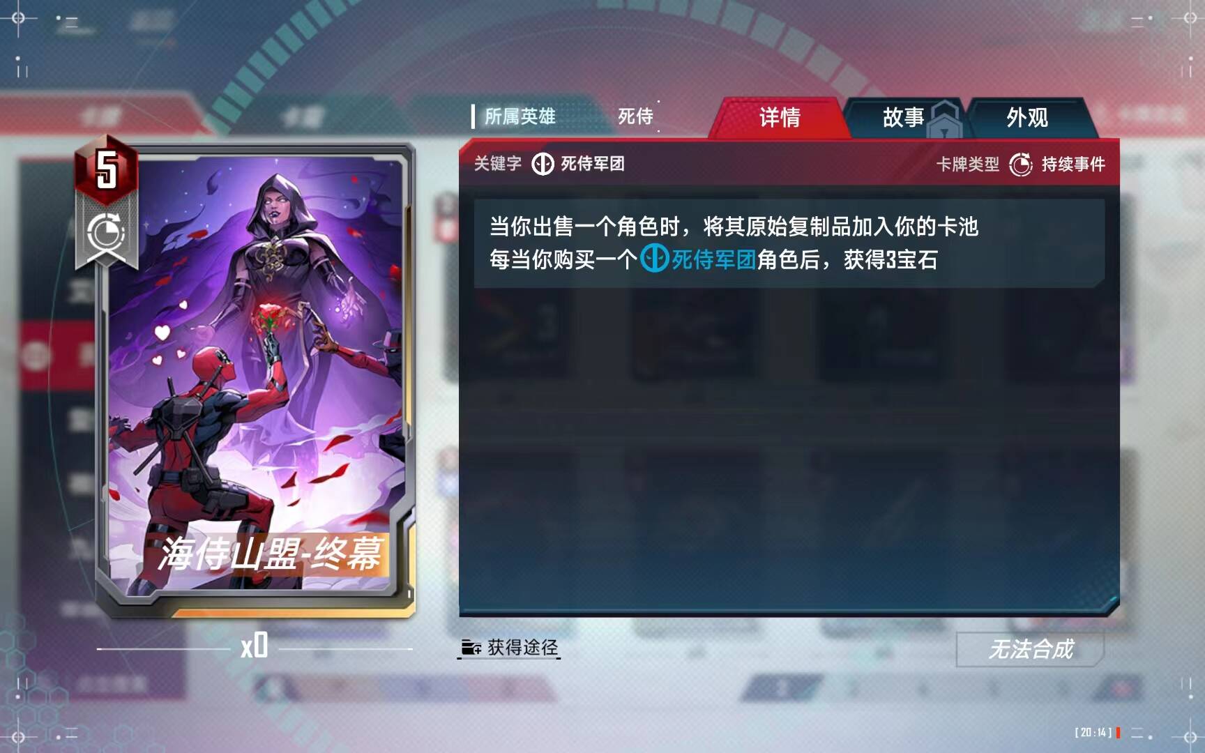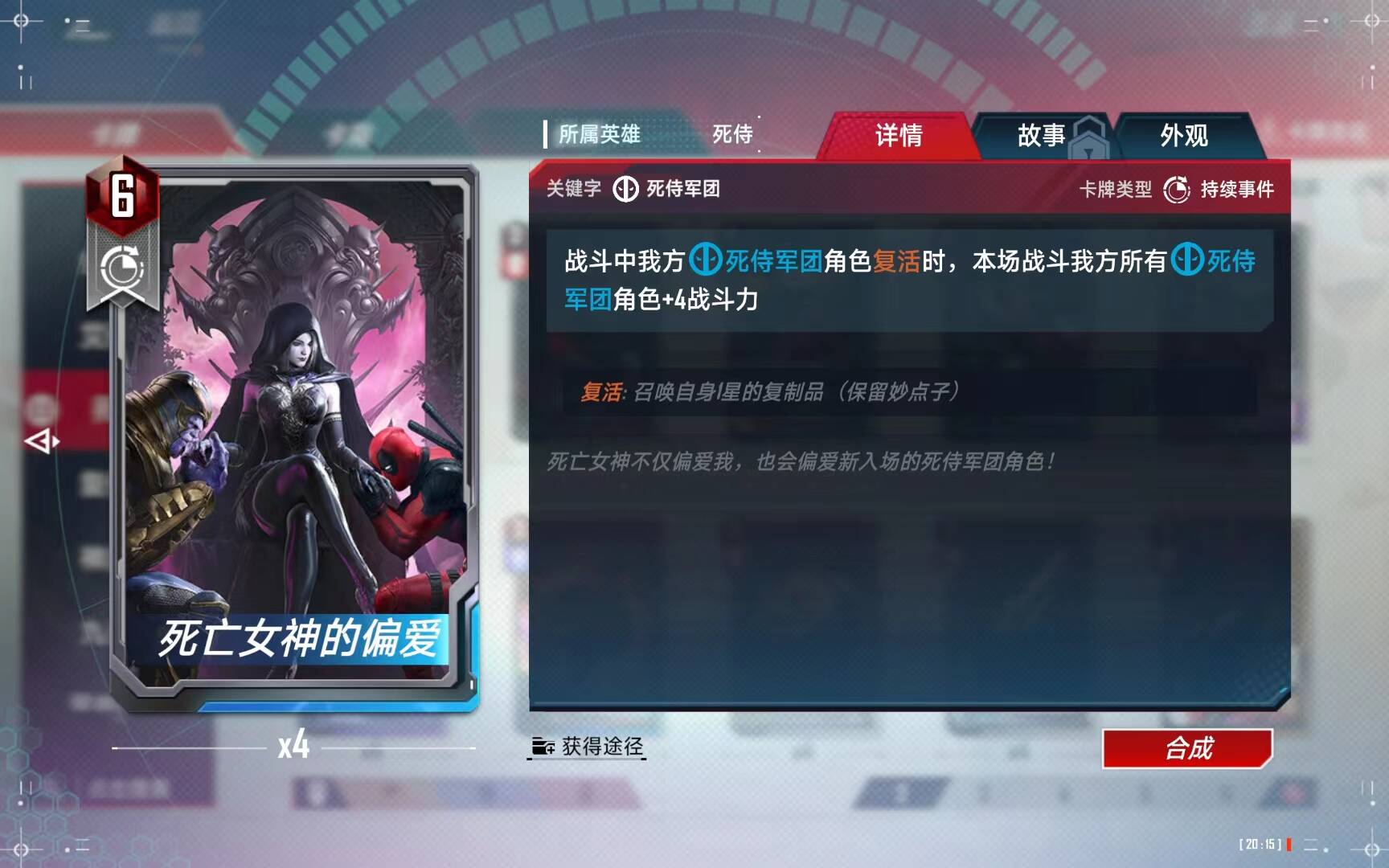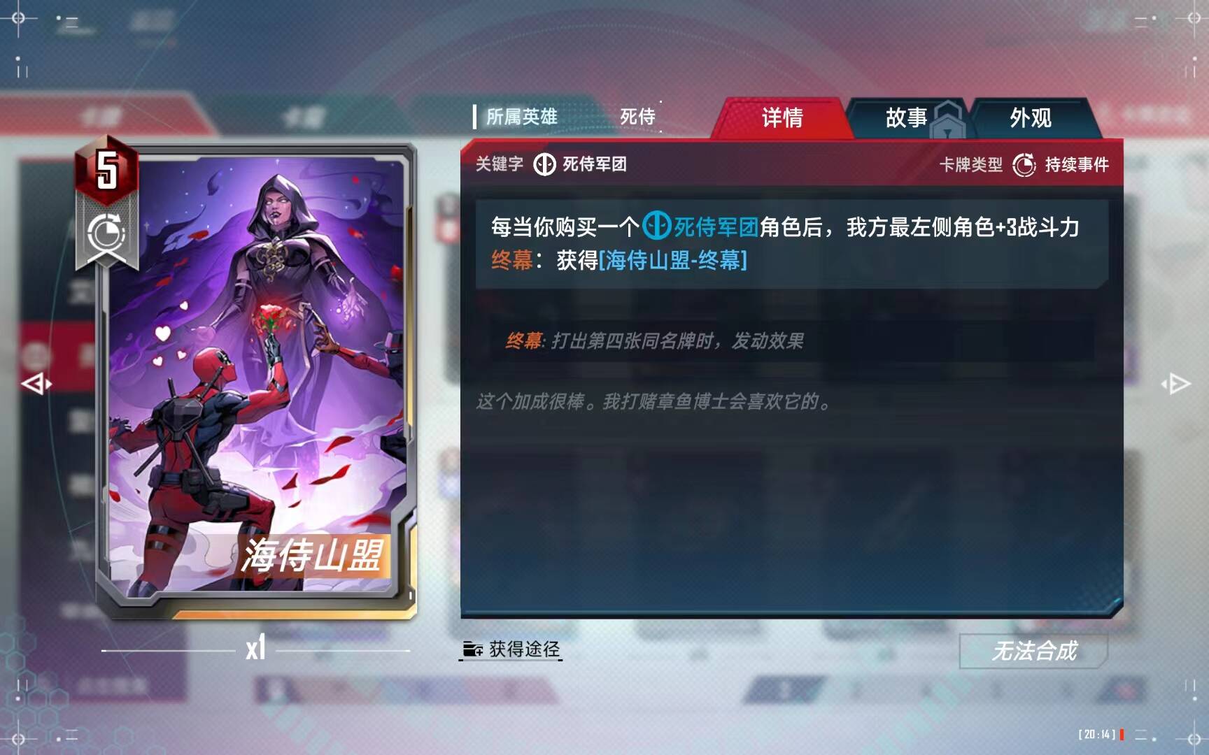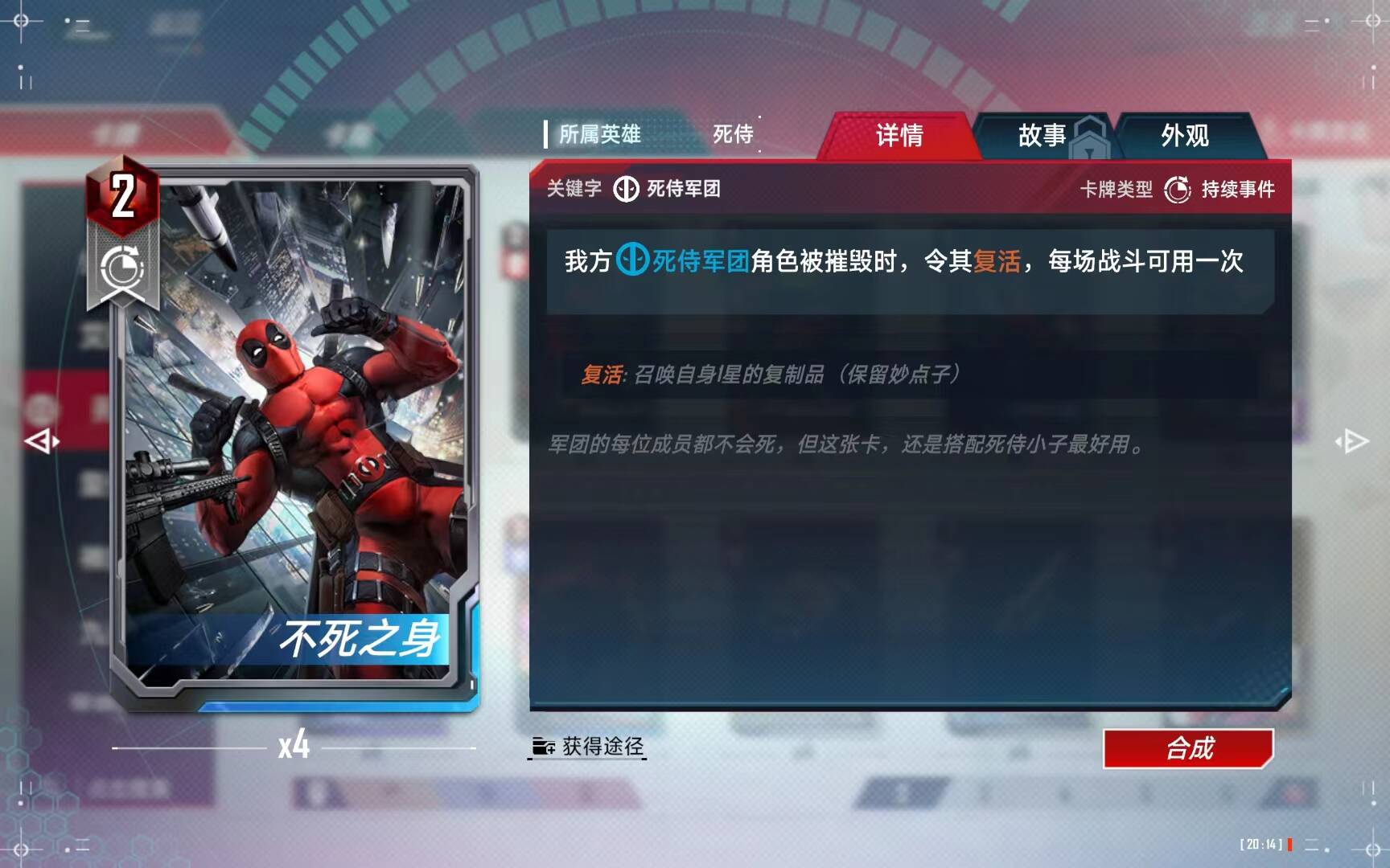 不死之身类似于x战警的暴风召唤,是属于死侍的核心事件卡,但是强度大家自己可以对比,最阴间的是:在场上满位置的时候,这个事件卡竟然可以和死侍小子的妙点子冲突,只能触发一次,有的同学说,位置不满不就不冲突了么?但是等你复活流场上位置不足6人的时候,事件卡早就触发完了,如果你以死侍小子为核心之一的话,这个事件卡只会白白浪费两次左右的触发机会。