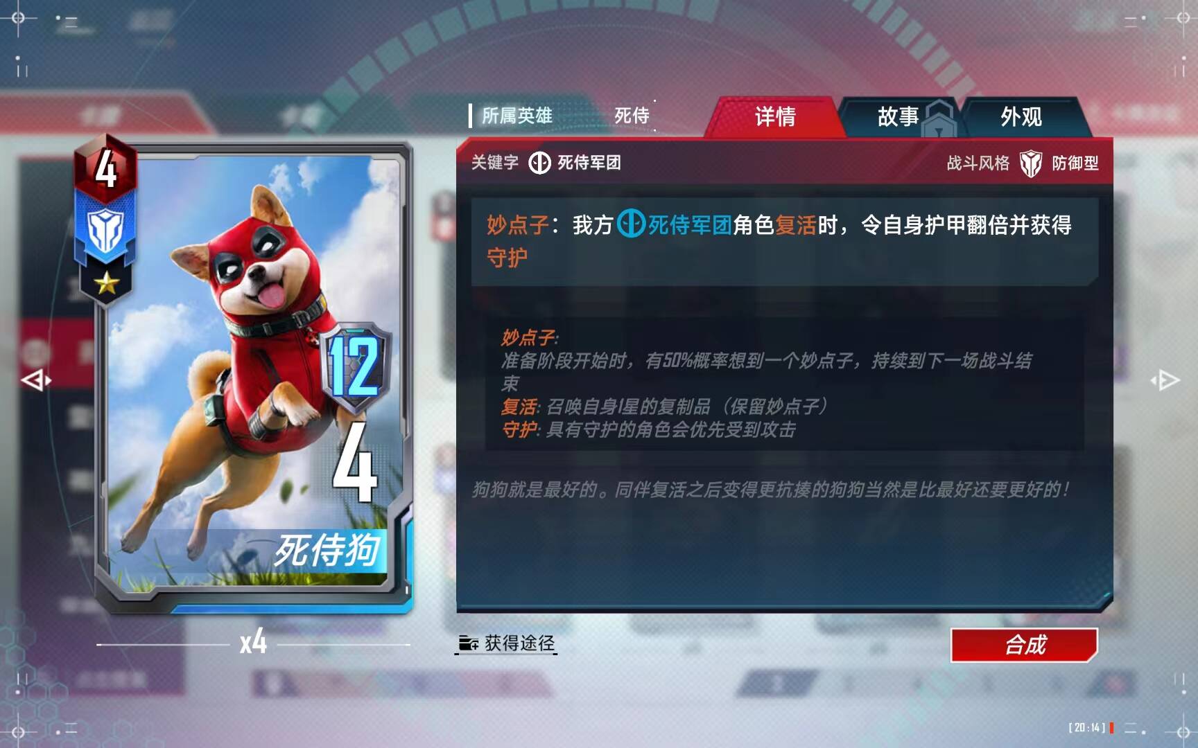 复活流的可选卡,后期狗的护甲经常可以达到一两千,可以有效保护我方的熊猫和死亡女神。