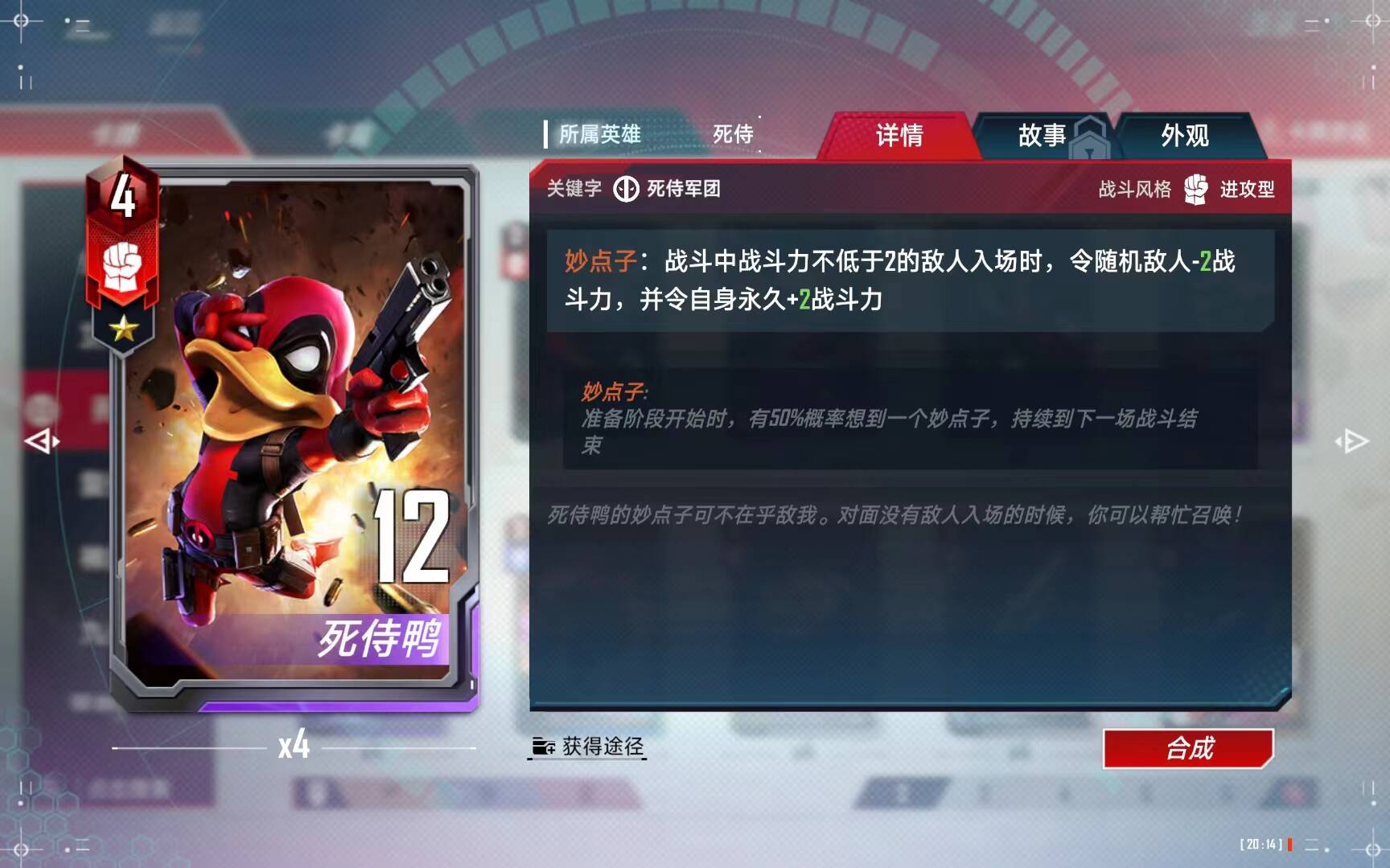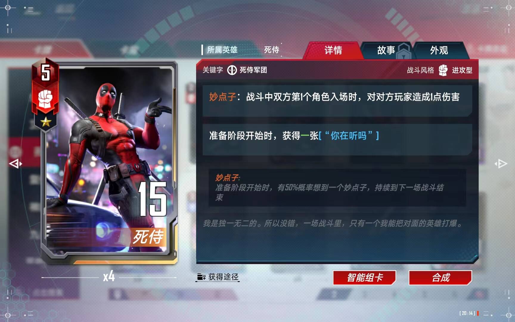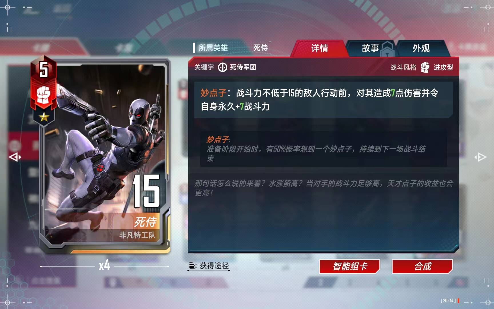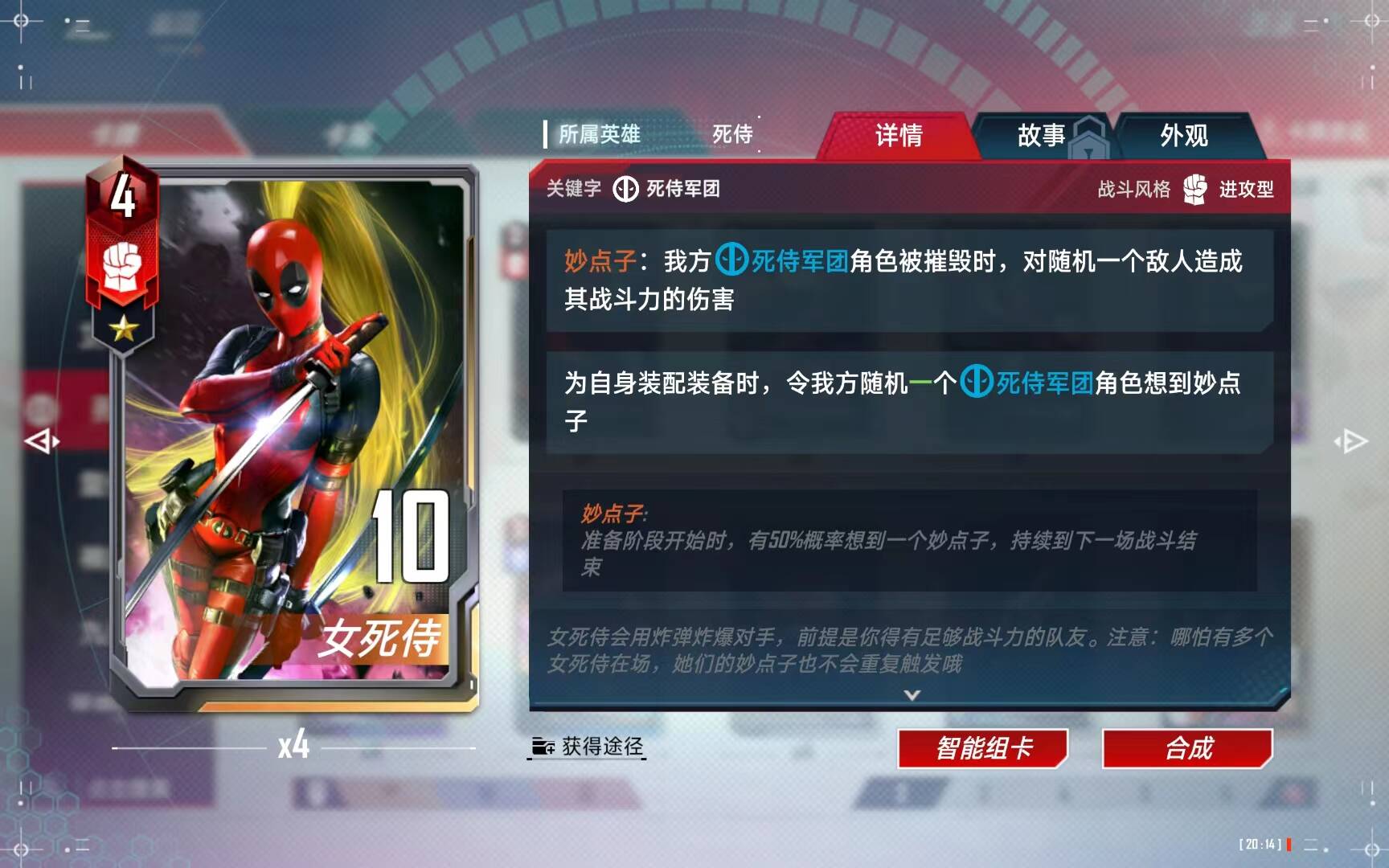 在女死侍在场的时候,给她佩戴或者更换任意红武器,即可给其他(根据星级增加数量)没有妙点子的单位想到秒点子。