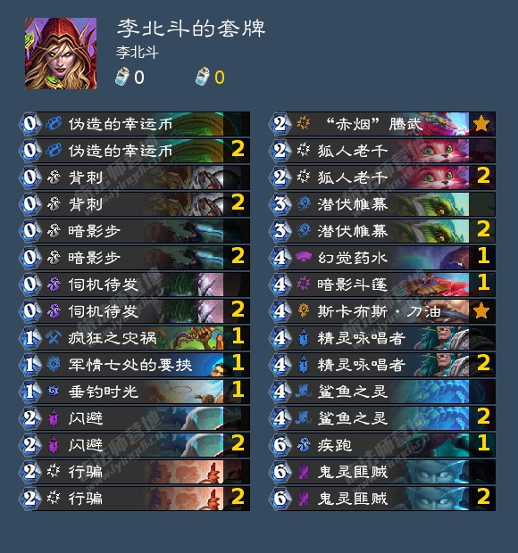 卡组的话因为是月初上传,快攻还是不可避免的一个问题,所以这套构筑携带了2个闪避1个斗篷(保住狗命),在剑圣推出以后,现在很多控制卡组都会带上这张万金油(战吼萨及各种宇宙体系),而这对鬼灵是一件比较头痛的事情,很多时候你用一个随从去测的话,就会拖慢很多的节奏,疯狂灾祸这张牌在这个时候就有了很大的作用,我选择了携带一张。其他的构筑基本和大多数人应该都差不多了。